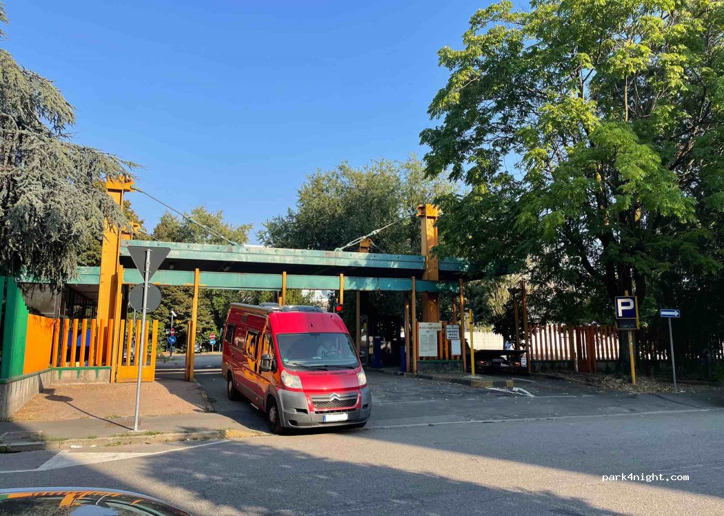 Inexpensive parking space right next to the bus / tram / metro station. Not monitored, but protected by a high fence. The parking lot is used by the Milan traffic police as a parking space for towed vehicles.