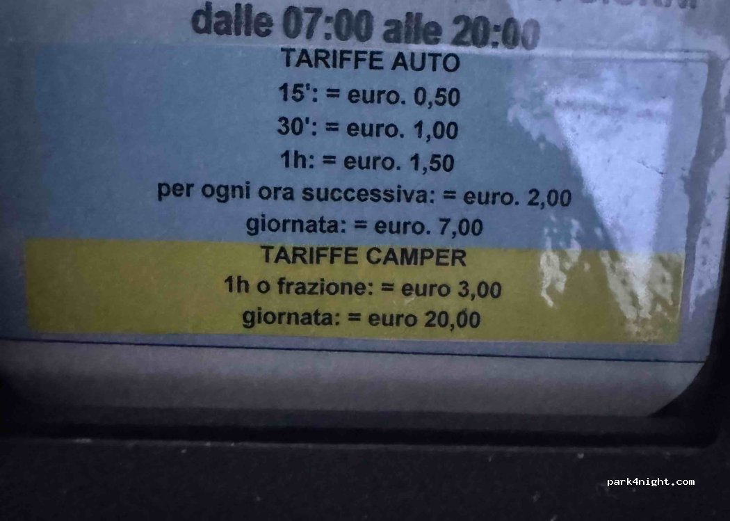 è solo un parcheggio a 20 euro x 24 ore senza servizi. credo che sia anche fuori legge visto il prezzo delle auto. sconsigliato . tutti i parcheggi per i camper nel comune hanno questi costi e tenuti male.