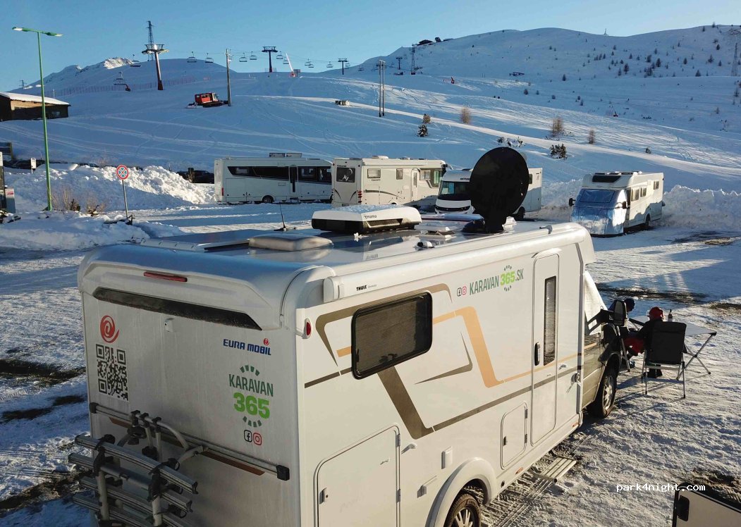 pěkné místo, voda tekla i při -10, možnost bezplatně načerpat vodu i vypustit wc a odpad. Pro obytňáky rovná plocha parkoviště. Dostatek místa. Lanovka i restaurace cca 100m.