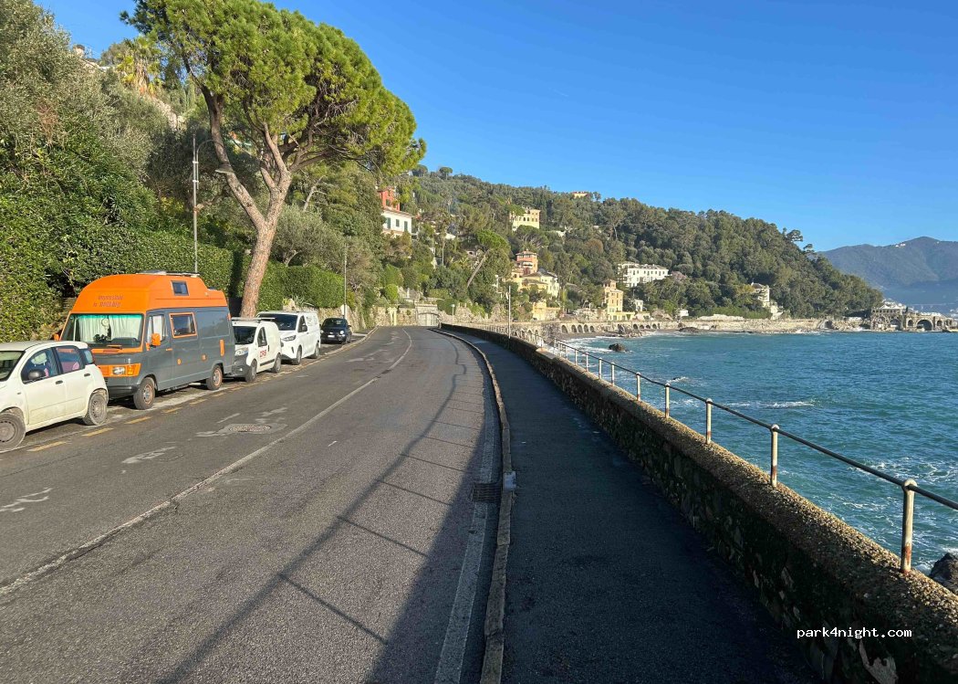 Buen lugar para aparcar GRATIS y sin tener problemas con la policía. Estuve 3 noches, un poco ruidoso por la mañana pero es un lugar Excelente para recorrer Portofino y Santa Margherita. Hay una playa con duchas y baños gratuitos de 8 a 20hs justo en frente de este sitio. Teniendo en cuenta lo difícil que es aparcar libre por la zona, me parece muy buen lugar!