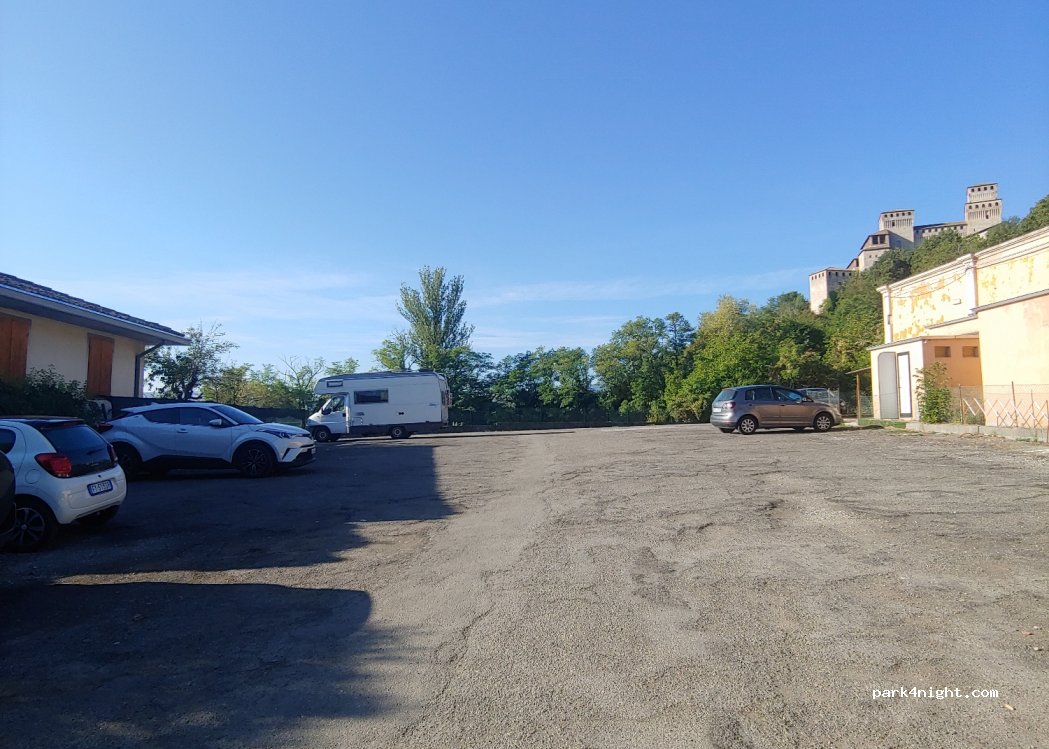 Parking près du château de Torrechiara. L'heure d'ouverture est de jour. A quelques mètres du parking se trouvent des toilettes publiques et un peu plus loin une fontaine où l'on trouve également des tables.