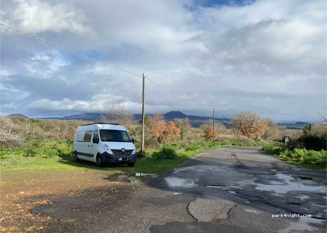Se garer un plus loin sur la gauche car très compliqué de rentrer sur la zone indiquée. Emplacement plat vue sur l’Etna, nuit au calme. Les gens passent en voiture mais on sent que l’on ne gêne pas. Une source à disposition pour remplir les bouteilles.