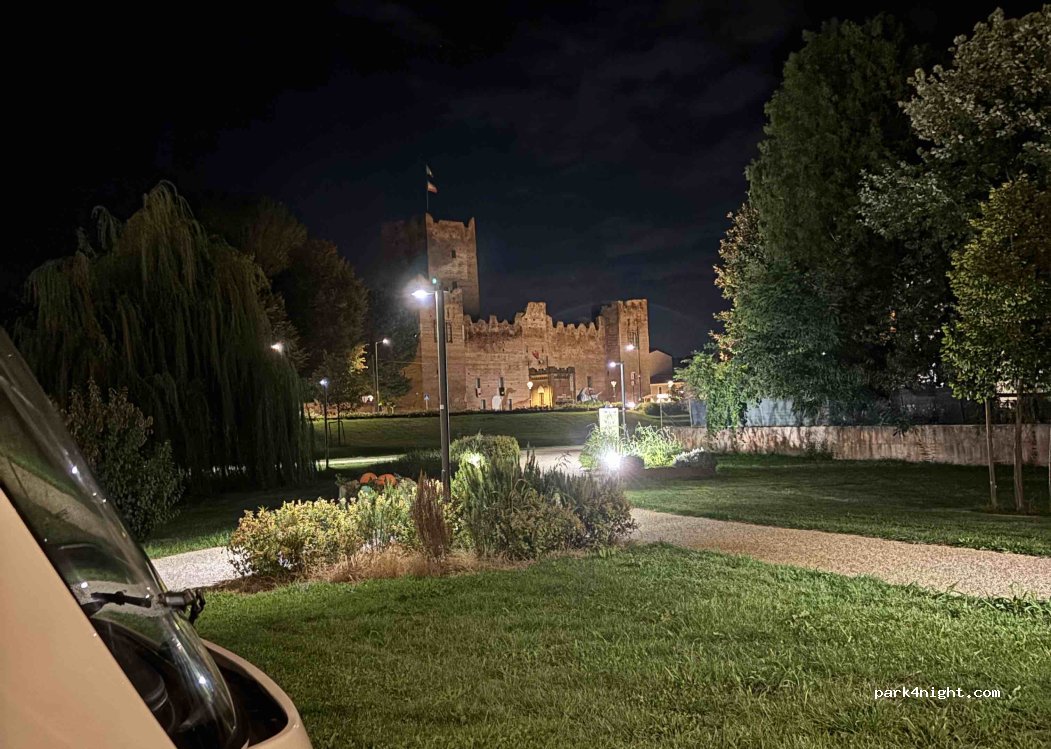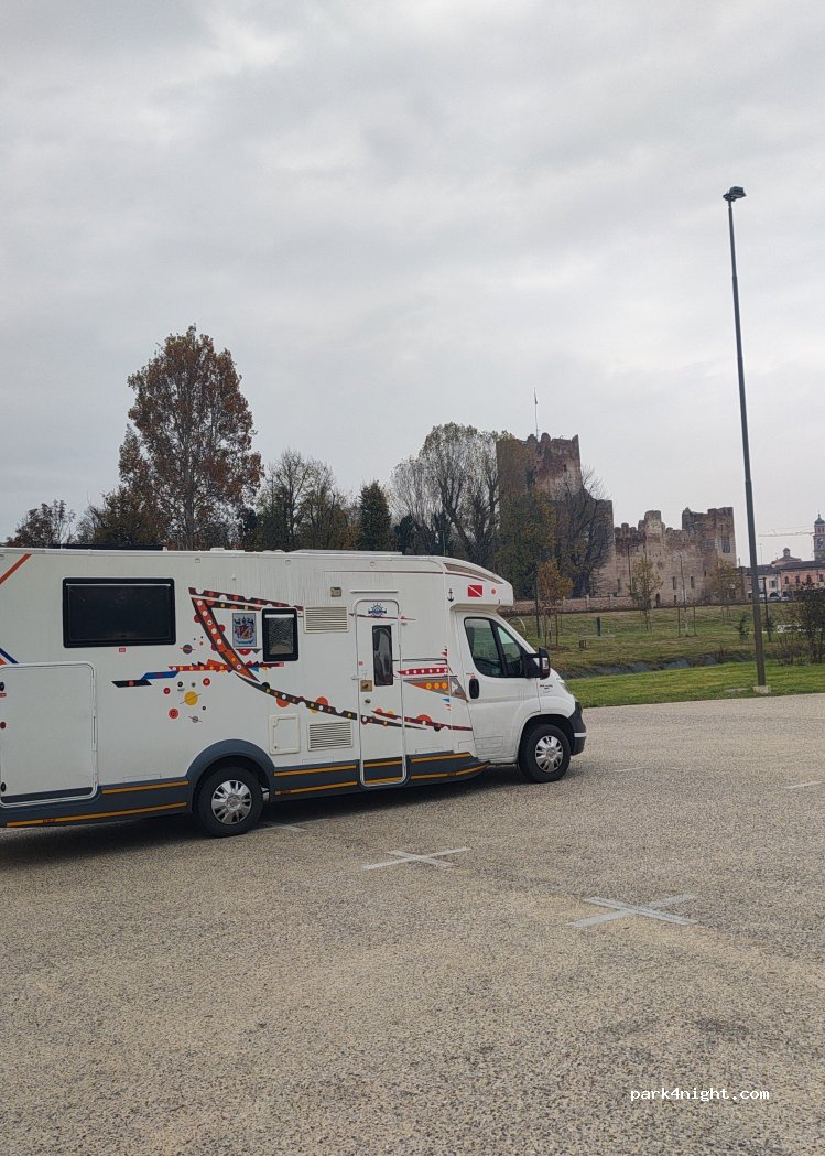 Ottima sosta per una notte; su asfalto pianeggiante, vista castello è inserito in un nuovo parco. Ad una estremità ci sono alcuni posti con uno spazio ulteriore, comodi per parcheggiare anche camper grandi. Ieri sera un po’ di rumore di ragazzini nel parco giochi, ma solo fino alle 23. No servizi ma c’è una fontanella nel parco a pochi metri.