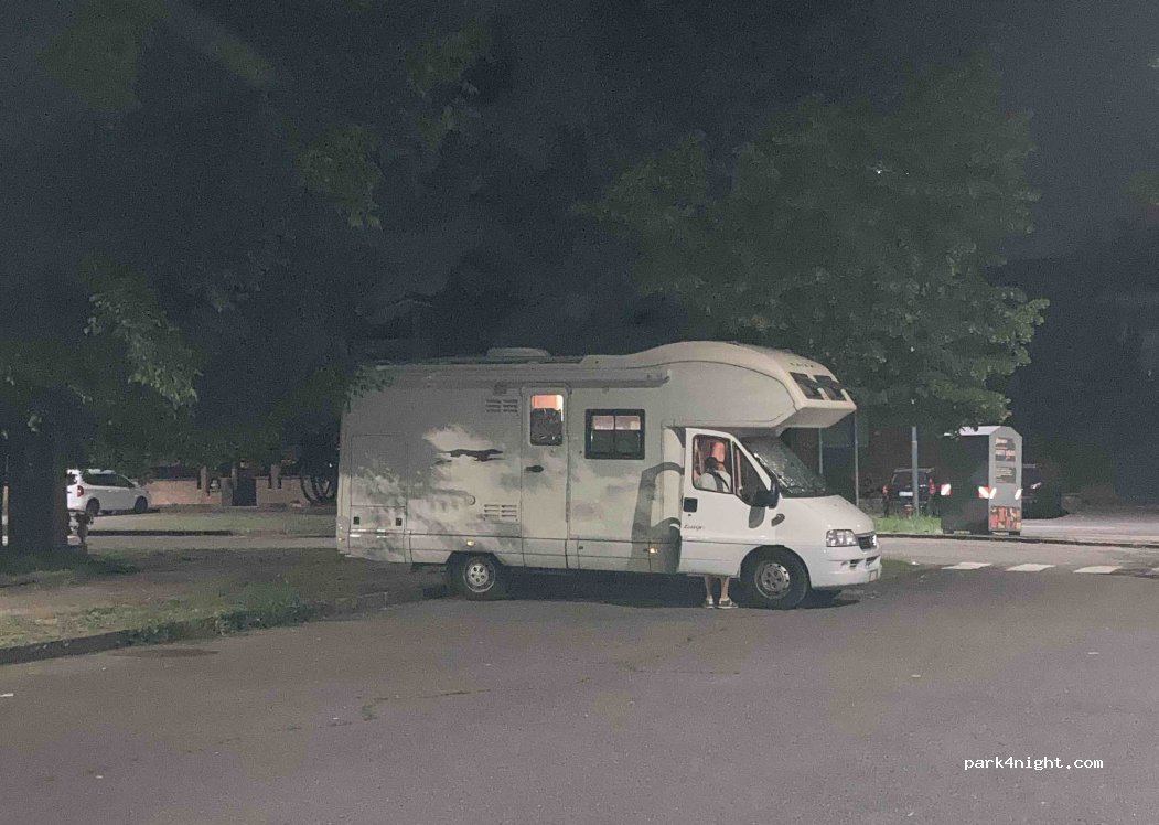 Ci siamo fermati una notte uscendo dall’autostrada per ripartire all’indomani visto la vicinanza (2km), in effetti un po’ di rumore arriva ma si dorme tranquillamente. In zona residenziale, ben illuminato, davanti ad un centro sportivo con bar e vicinissimo ad un parco con giochi e passeggiata. Bidoni per la differenziata