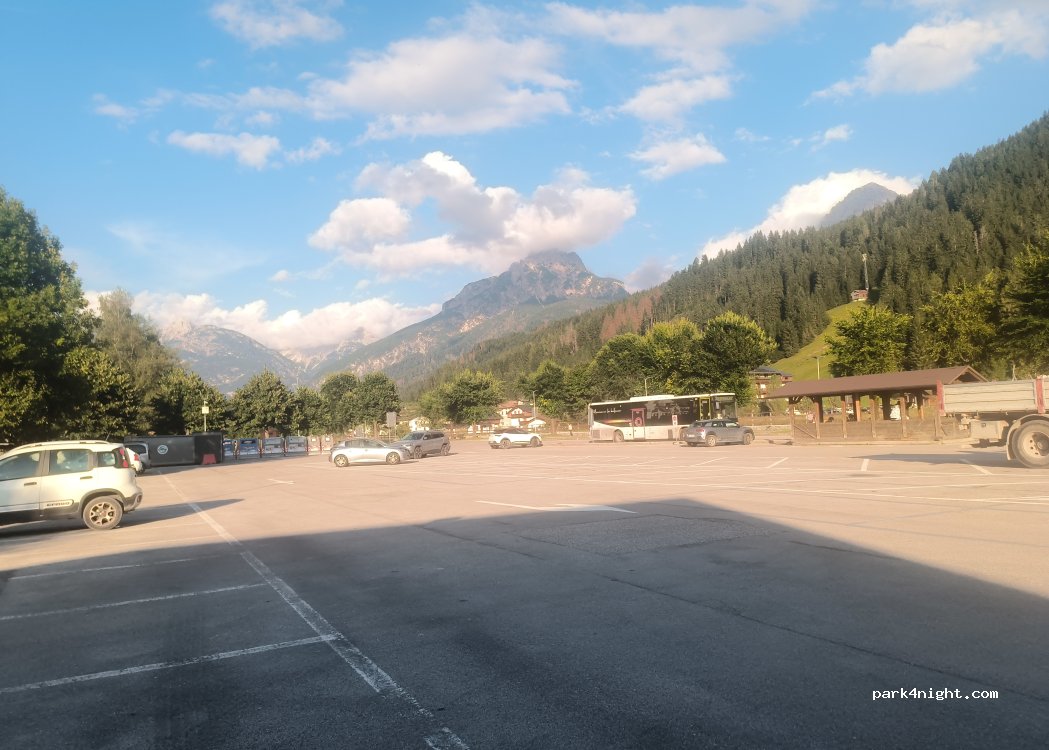 Parking by the river in Santo Stefano di Cadore, next to the tennis court. Illuminated, tarred area, waste area at the end of the square. 2 parking spaces reserved for trucks. In the 'tennis bar' you can eat and drink something. 500m to the town center. The nearest disposal stations are indicated on the sign - see photo. Sign incomprehensible, but space is at least suitable for a stopover.