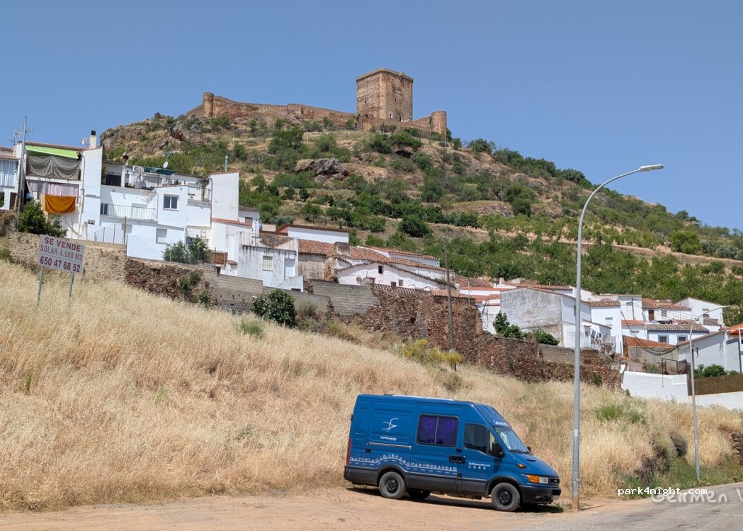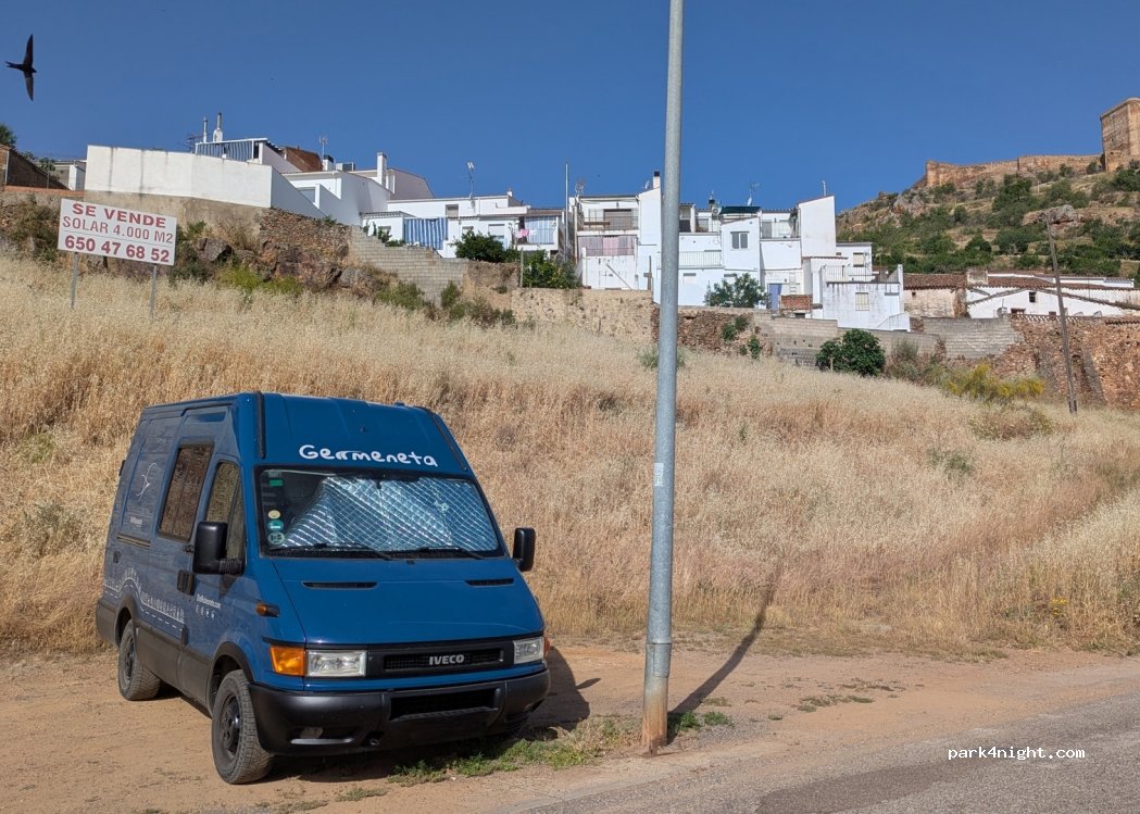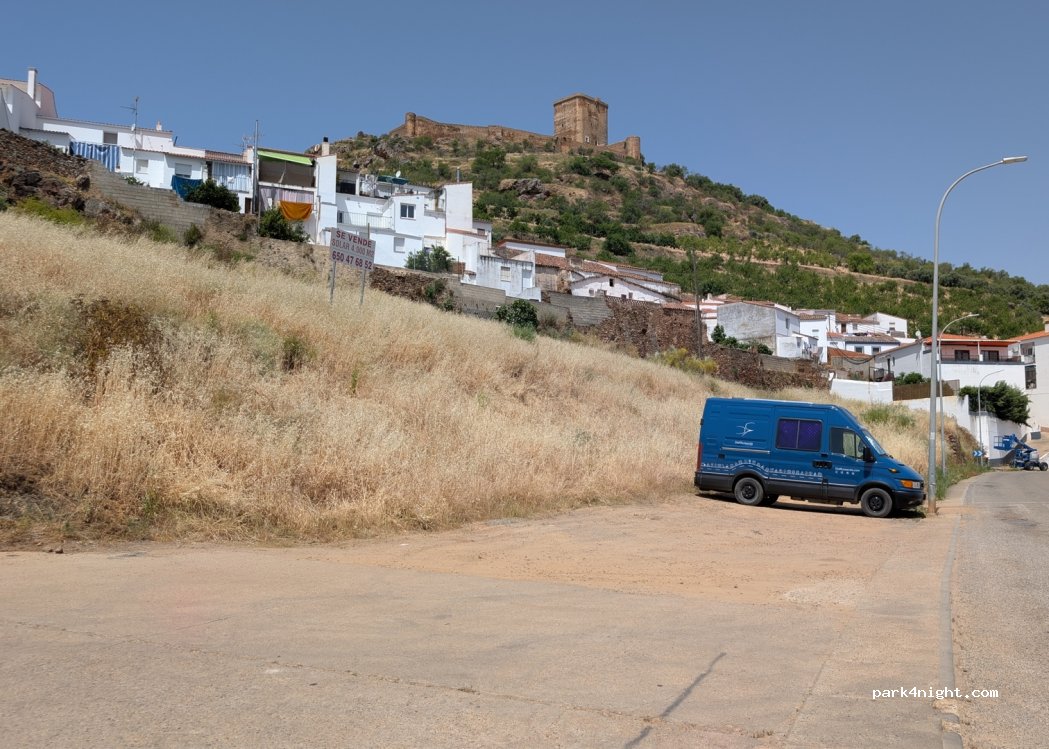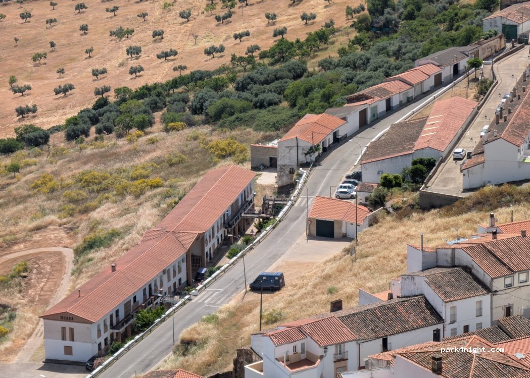 Aparcamiento recomendado por el municipio de Feria para visitar el pueblo. Cuenta con 2 o 3 plazas (¡ojo! no aparcar en la zona que utiliza el autobús para dar la vuelta). No se recomienda entrar con un vehículo grande en el pueblo. Mejor aparcar aquí y hacer la visita andando. Está a unos 10 min. del centro. Gracias al municipio de Feria por recomendar un lugar para visitarlo en vehículo vivenda
