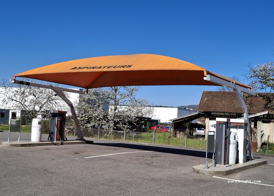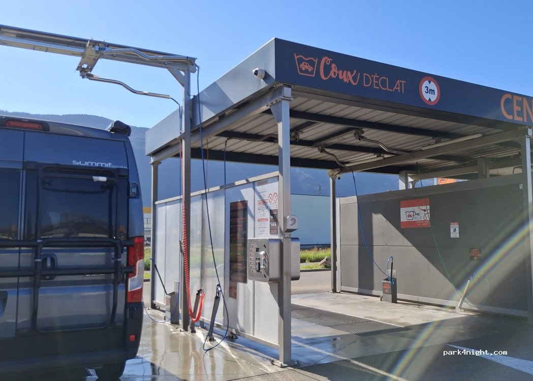 Très belle aire de service de nettoyage pour les vehicules de grande hauteur, aspirateurs, lave-linge... Semble très récente.
