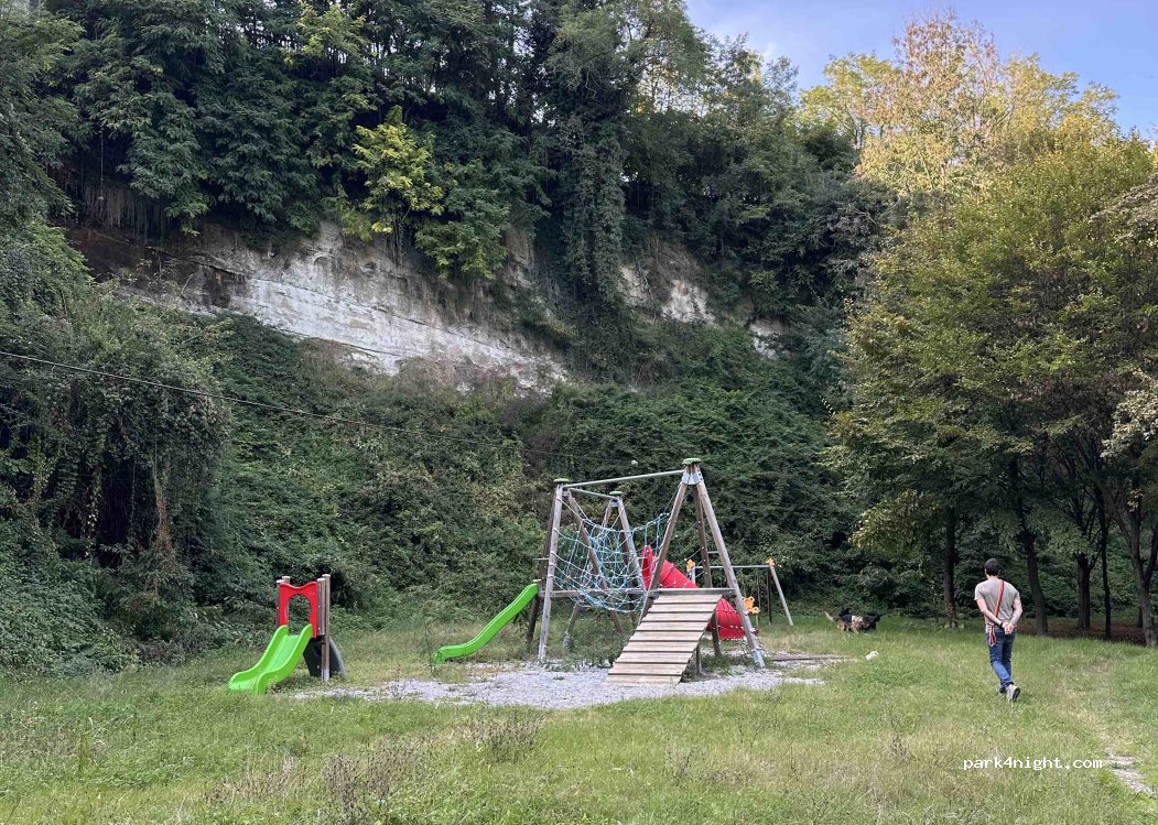 Area di sosta con corrente 1 euro per 2h, molto silenziosa, nascosta tra gli alberi, stradina poco trafficata, la mattina ti sveglia il campanile appena soprastante. Ottima per passare la notte e fornita di mappe per sentieri della Via del Gesso.