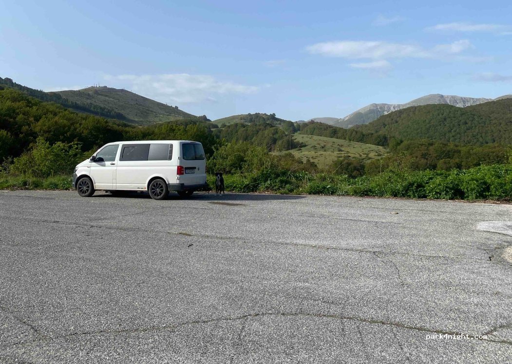 Asphaltierter Parkplatz an einer, zumindest im Mai, sehr wenig befahrenen Straße. Der Platz ist leicht abschüssig, was wir aber kaum bemerkt haben. Schöne Aussicht auf die umliegenden Berge. Wir hatten eine ruhige Nacht.