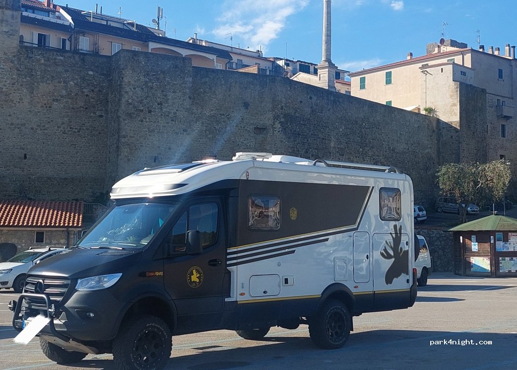 Mit 2 Euro pro Stunde teuer und eng, aber mit einem kurzen Wohnmobil machbar. Talamone ist ein schönes Städtchen und einen Besuch wert.
