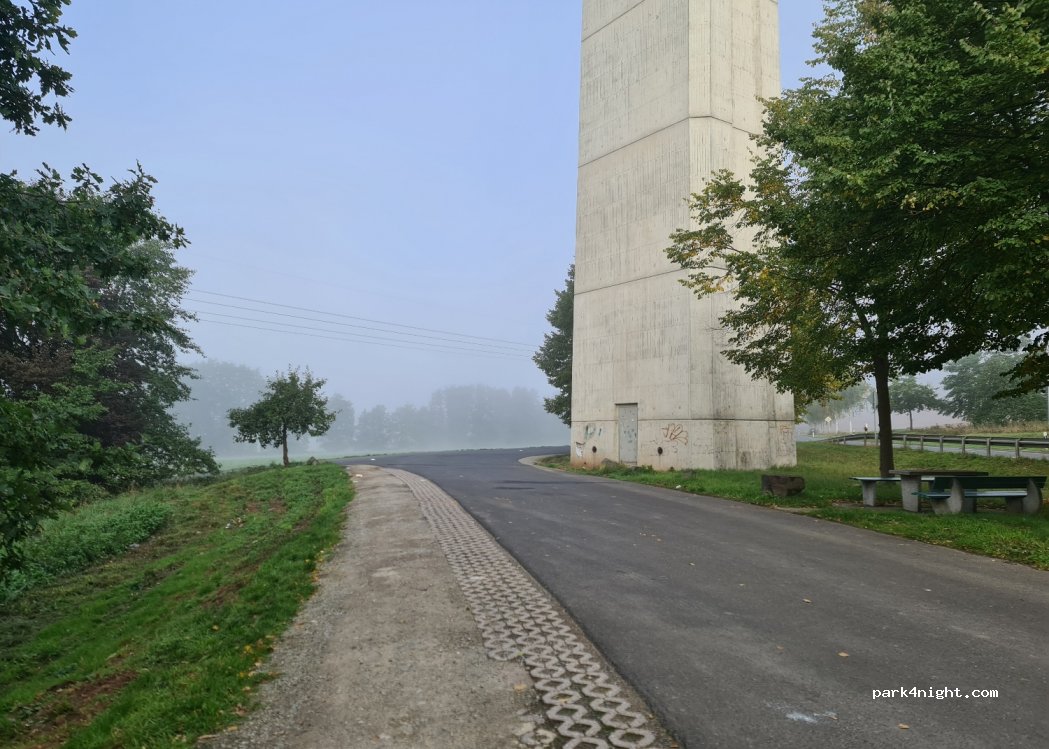 Petit parking tranquille dans une rue peu passante. Sous un pont de chemin de fer, mais cela n'a pas vraiment d'importance. Idéal pour passer la nuit en passant par l'autoroute.