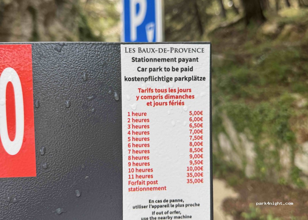 en octobre moins de monde.j'ai pu garer mon camping car de 7 ,20m sans problème...allez visiter les carrières de lumières c'est spectaculaire..et monter jusqu'en haut du château,on a de très belles vues....parking payant..nous sommes restés 4h prix 7e.... si vous lisez les autres commentaires,le soir il n'y a plus personne et pas d ,interdiction de passer la nuit...le parking n'est payant qu'à 8h