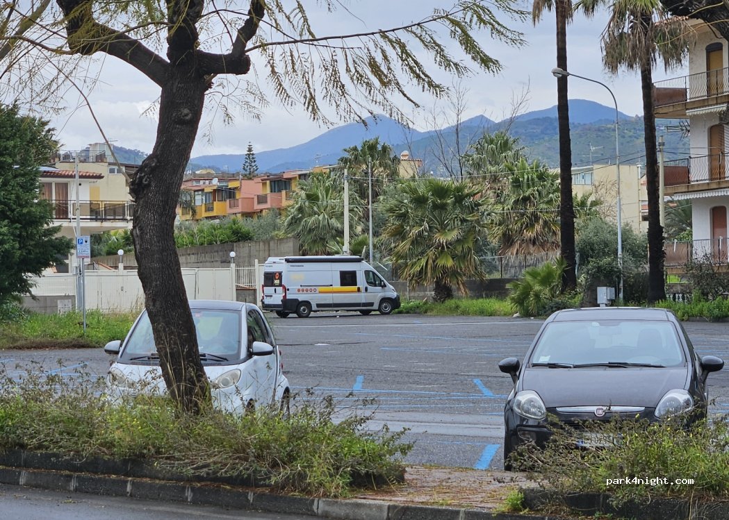 We stayed 1 night in this free !big flat empty lot. it was totally quiet until about 8am when the public buses will stage here but not a bit deal at all. just 1 bus parked near us and shut off the engine. very easy to catch the interbus public bus to go to taormina. 3 euro every 30 mins. 15 mins to get to the taormina bus depot and walk 5 mins to the main street. the bus stop has staff.