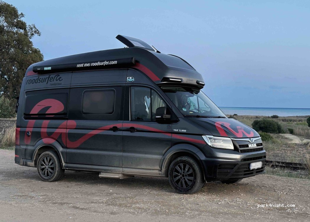 Just at the entrance to the reserve there are various open spaces to park even 6-meter motorhomes like ours, no problem. there is a no parking sign but on the opposite side, I believe that in this low season month, even beyond, you can park safely obviously no service