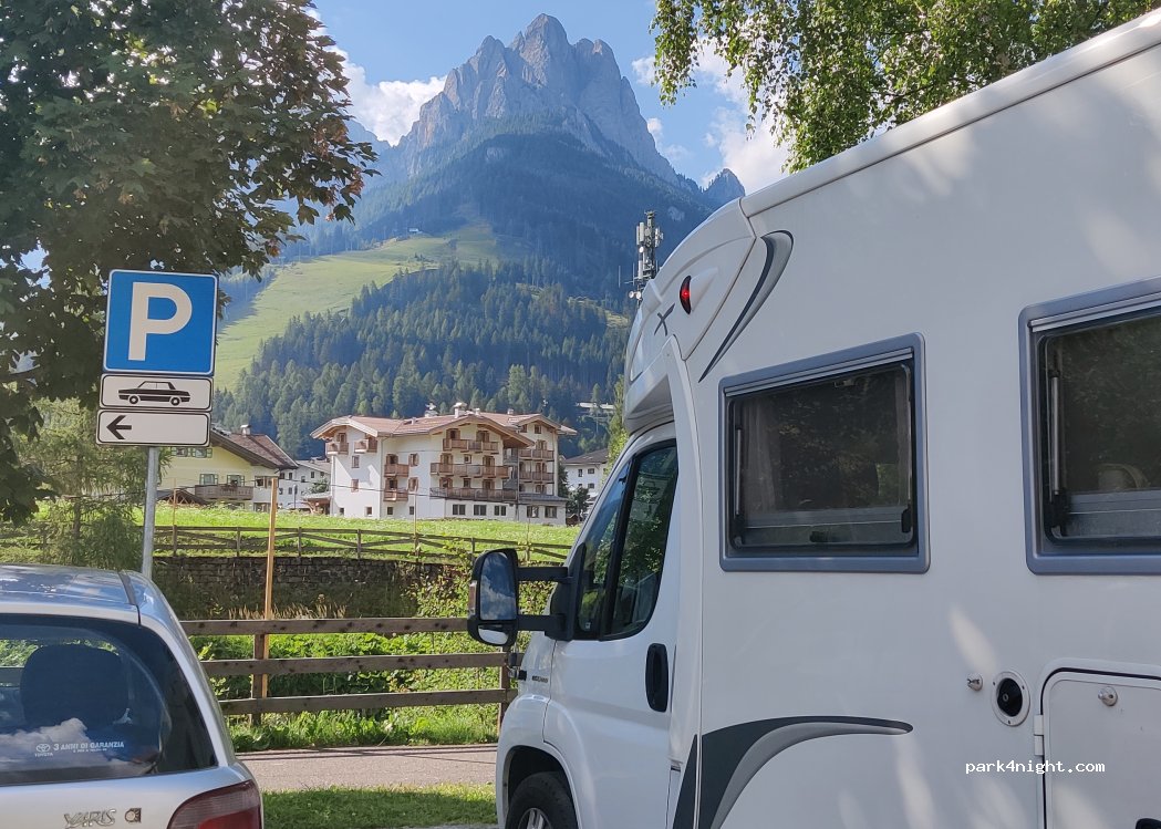 Abbiamo trascorso qui una notte. Ci sono 6 spazi riservati ai camper, molto stretti ma in piano e la sosta è gratuita e consentita per 48 ore. A piedi si raggiunge facilmente il centro di Pozza di Fassa, a 800mt c'è la seggiovia Vajolet, QC terme dolomiti (consigliatissime) a 1km. Di fatto è un parcheggio.