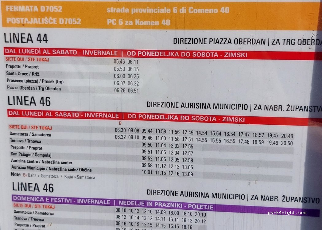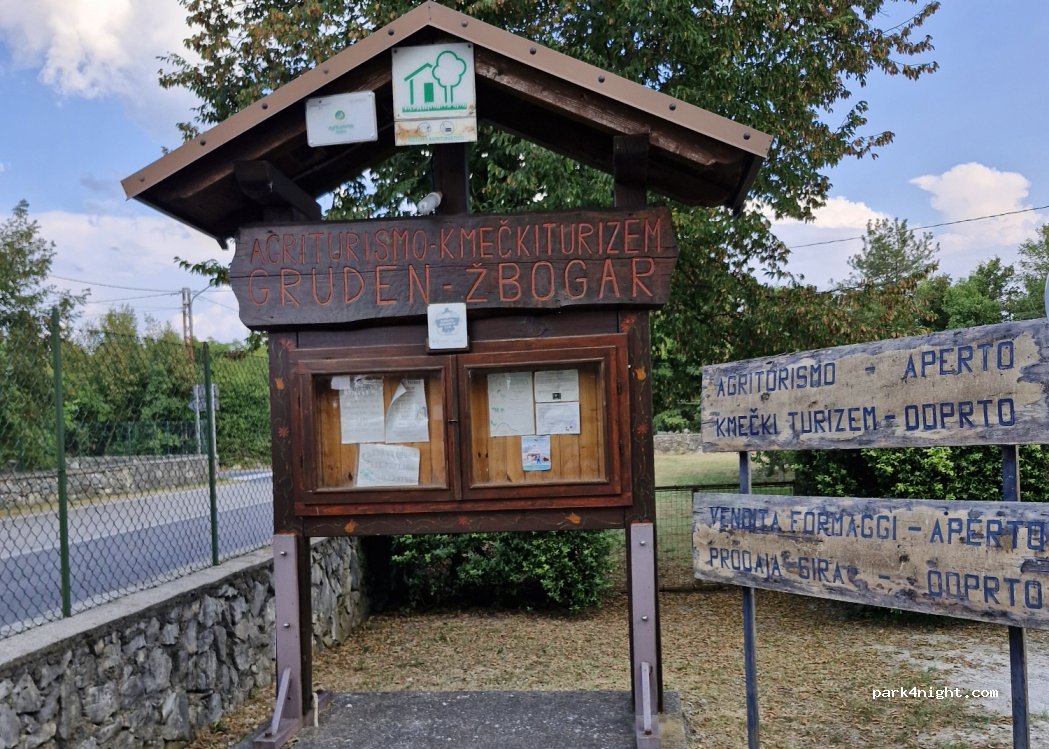 Parking pour camping-cars avec électricité, eau potable, Wi-Fi, point de remplissage et de déchargement d'eau potable, et portail électrique à code. Juste à côté se trouve la ferme Gruden Zbogar, proposant des produits locaux. Ouverte toute l'année, elle est également ouverte du mercredi au dimanche en hiver. Vous y trouverez des produits fermiers (fromages de vache et de chèvre, viande de bœuf et de porc, charcuterie, vin, miel, confitures, sirops, épices, purées, sauces et légumes de saison). Située au cœur de la verdure du Karst de Trieste, la ferme est à 25 minutes en voiture du centre-ville et à 40 minutes en bus.