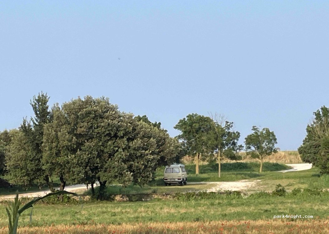 Really serene spot to lay back and chill. Maybe go for a bike ride and/or walk. It’s the parking of the Casoni della Fogolana which are the huts in the picture added. Was here for 2 nights on 5/10 and 5/11. There were 2 other vans on both nights. Like others have said there is a max width of 2.4m. We were able to get sneak through with our Mercedes Sprinter by folding the mirrors in.