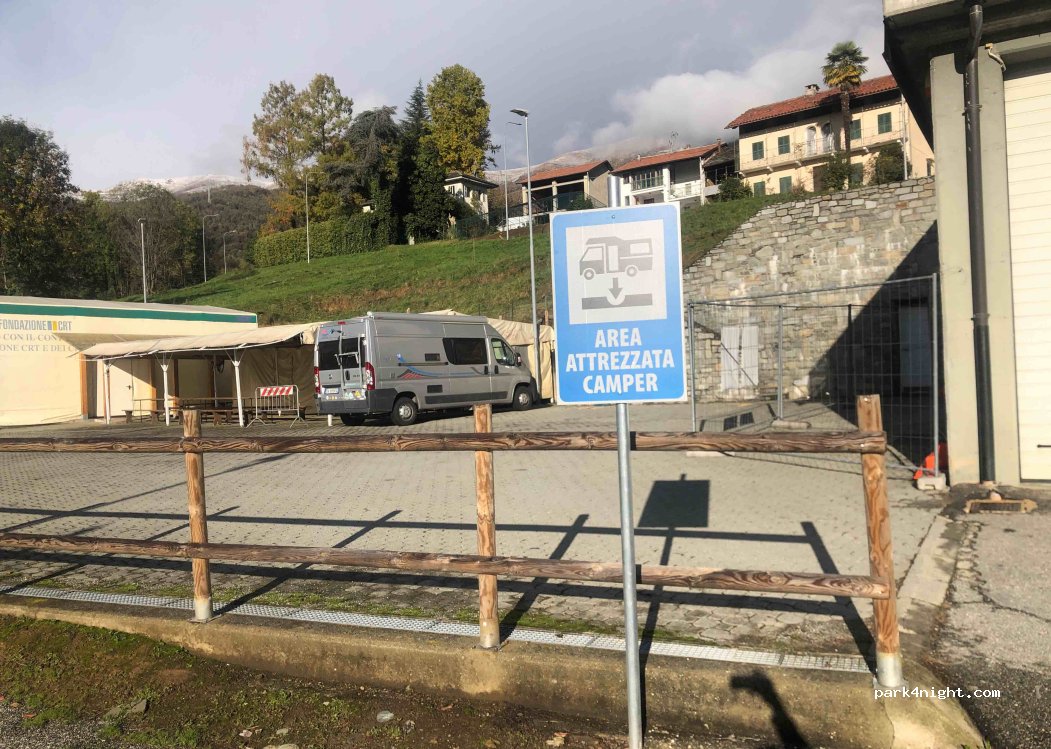 Free municipal motorhome area in the city center but quiet. View of the meadows and Mount Soglio behind. Night lighting.