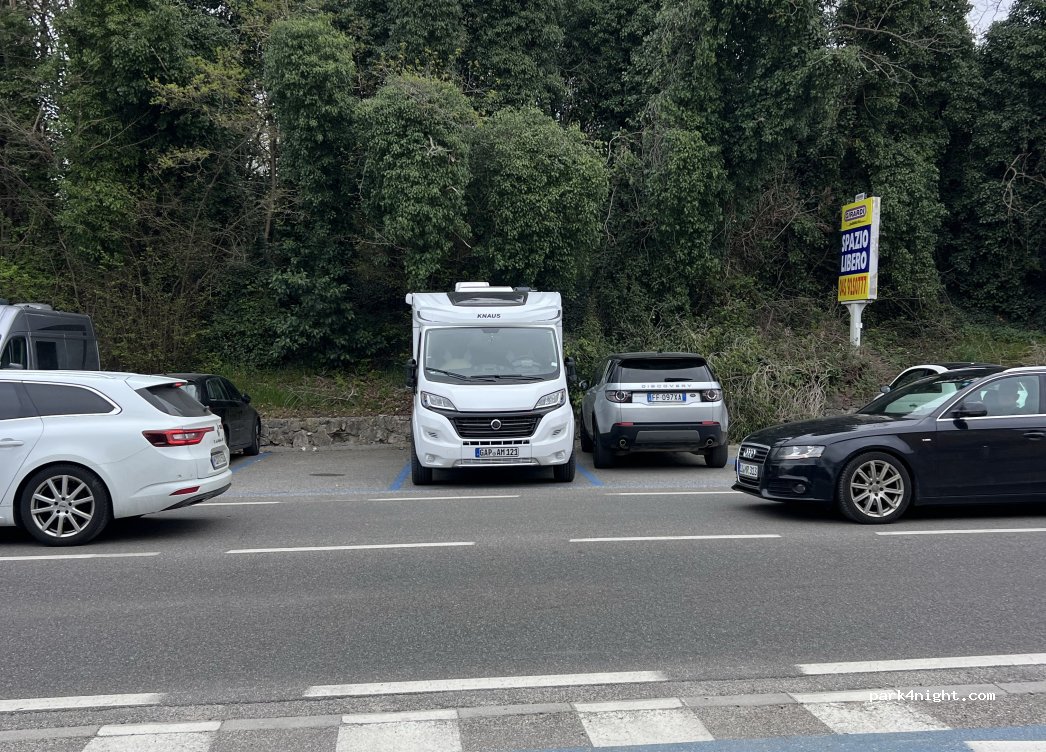 Es handelt sich hierbei um einen Parkplatz direkt an der viel befahrenen Straße. Ich habe aber hier schön öfters geschlafen und tagsüber des Strand von Lazise besucht. Genau gegenüber vom Parkplatz ist eine Pizzeria wo man sich mittags oder abends auch mal eine leckere Pizza holen kann um Sie am Strand zu essen. Tagsüber gebührenpflichtig. Nachts kostenlos.