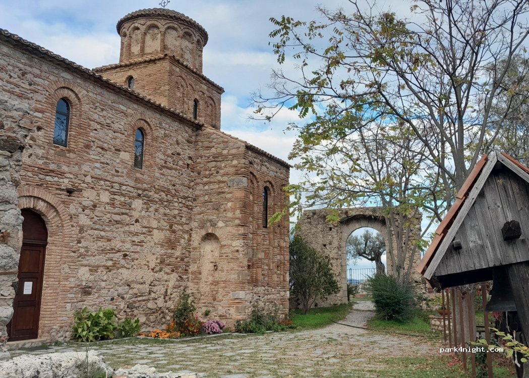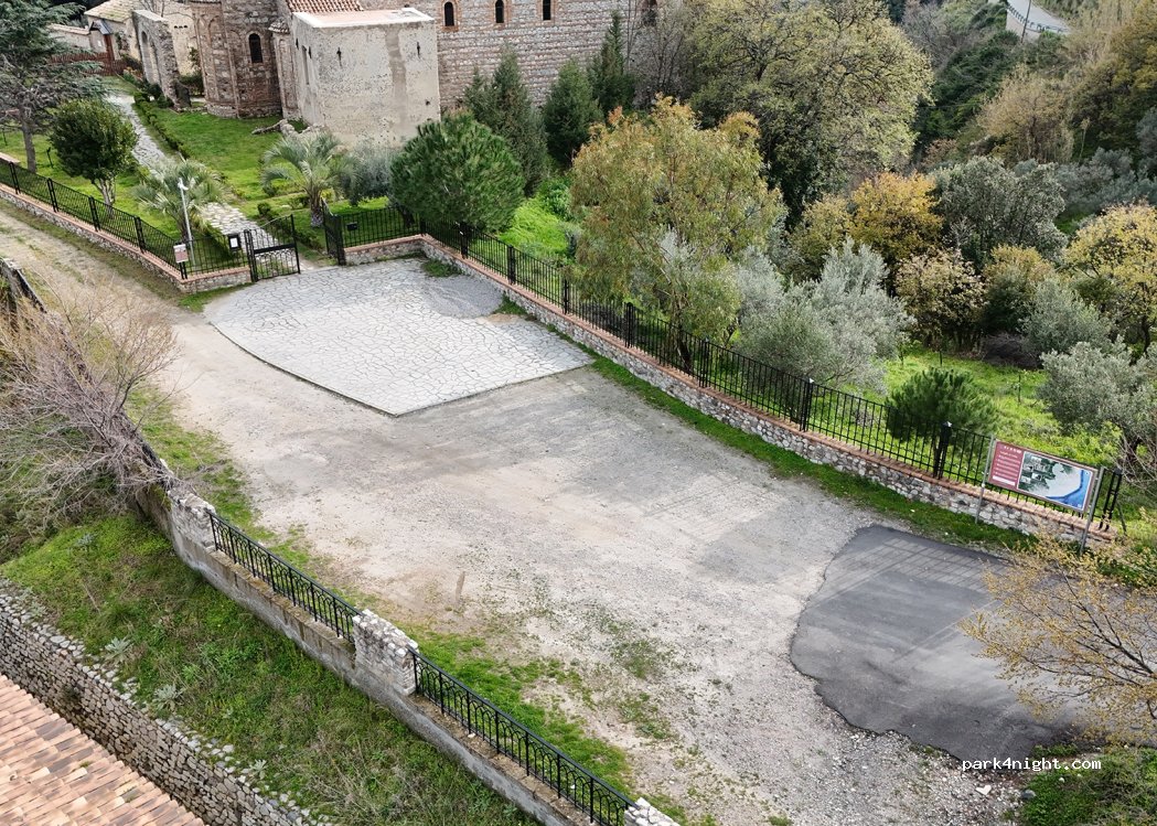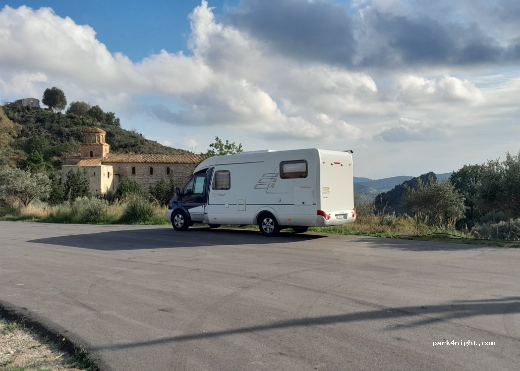 Parcheggio del monastero, asfaltato, un pò inclinato, c'è posto per 2/3 camper non superiori a m. 6,60. Abbiamo visitato la Chiesa e trascorso la notte in totale tranquillità e completamente al buio, non essendoci lampioni. Nei pressi c'e una toilette pubblica. Strada percorribile con prudenza, vale la pena visitare il posto.