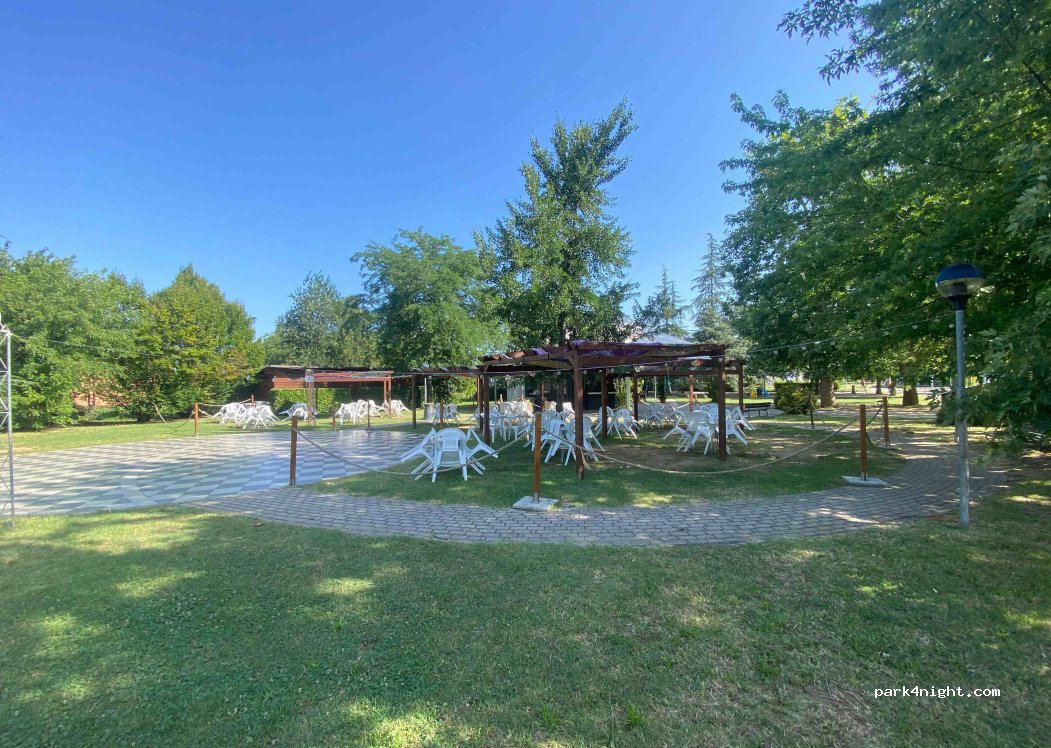 Parcheggio fronte parco illuminato tranquillo. pernottamento senza problemi