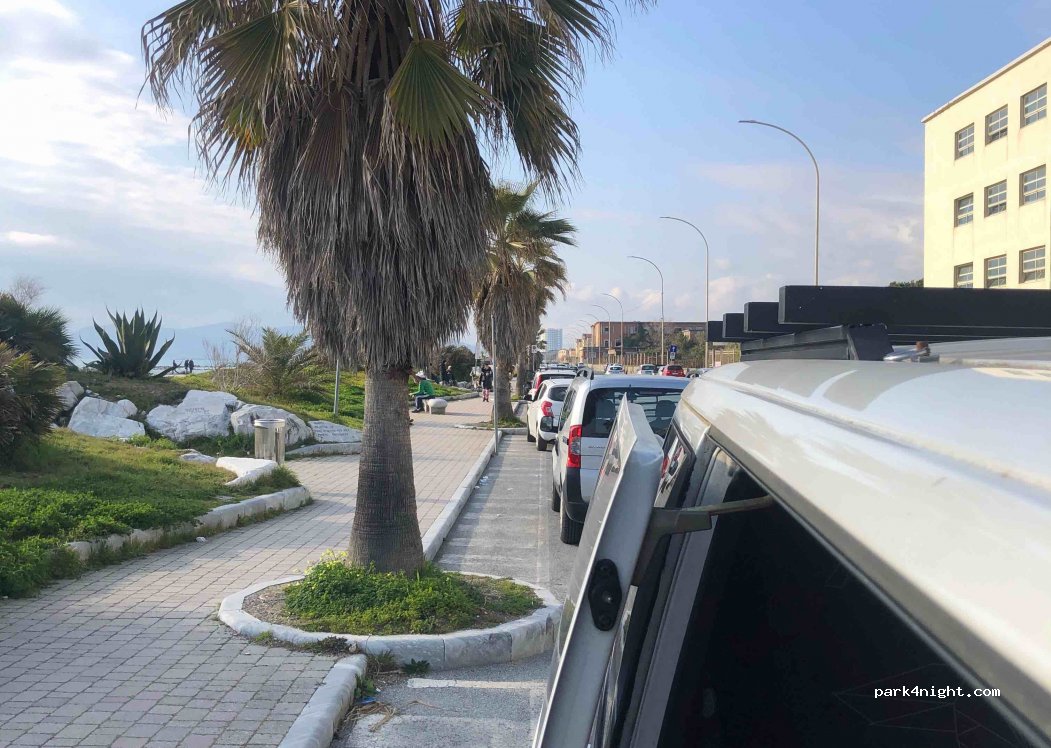Eine relativ ruhige Straße mit vielen Parkmöglichkeiten, direkt am Strand. Kleine Steinbänke zum sitzen, wunderschöne Meer Aussicht. Ob man über Nacht stehen kann, weiß ich nicht.
