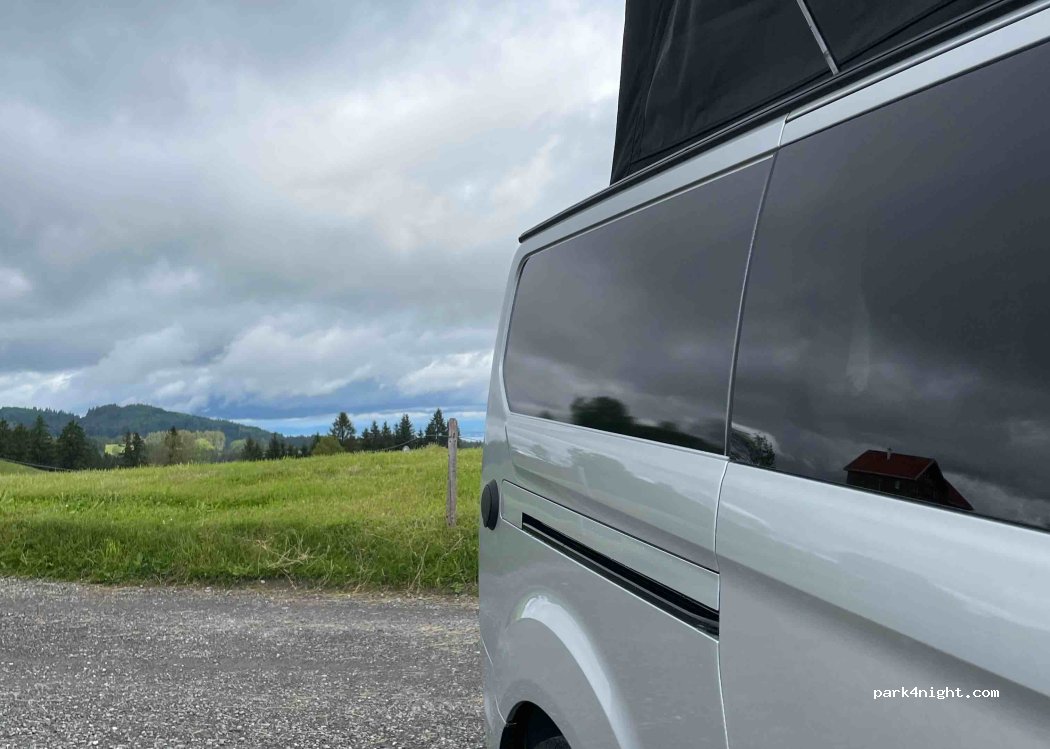 Public car park with a view of the mountains and Lake Constance. Windy location. Until about 20:00 traffic from the surrounding farms, then 1 quiet night spent with a wonderful sunrise.
