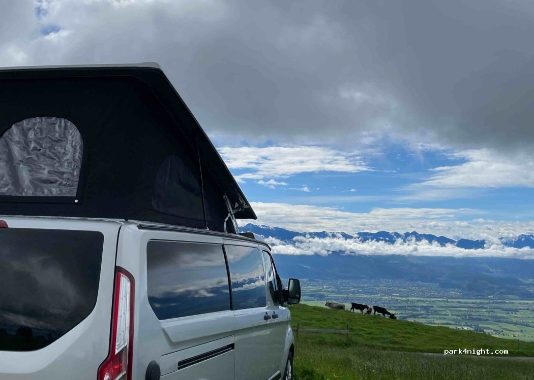 Openbare parkeerplaats met uitzicht op de bergen en het Bodenmeer. Winderige locatie. Tot ongeveer 20.00 uur verkeer van de omliggende boerderijen, daarna 1 rustige nacht doorgebracht met een prachtige zonsopgang.