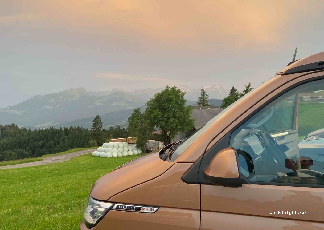 Öffentlicher Parkplatz mit Blick auf die Bergen und auf den Bodensee. Windige Lage. Bis ca 20:00 Verkehr von den umliegenden Bauernhöfen, danach 1 ruhige Nacht verbracht mit herrlichem Sonnenaufgang.