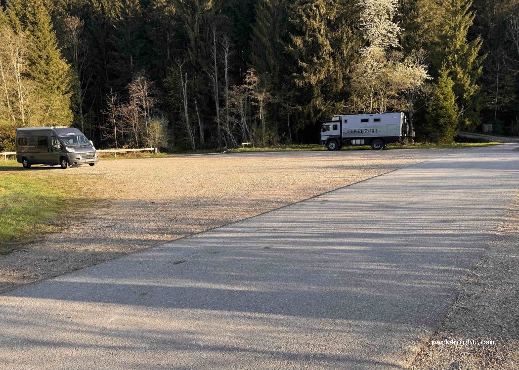 Grosser , halbwegs ebener Schotterplatz. 12 EUR von 18:00 - 09:00 , danach 1 EUR pro h. Hunde am Parkplatz erlaubt, am sehr schönen Wiesen- Kiosk und Badegelände nicht. Kiosk mit Toiletten von 10 bis ca 19:00 bei schönem Wetter offen.