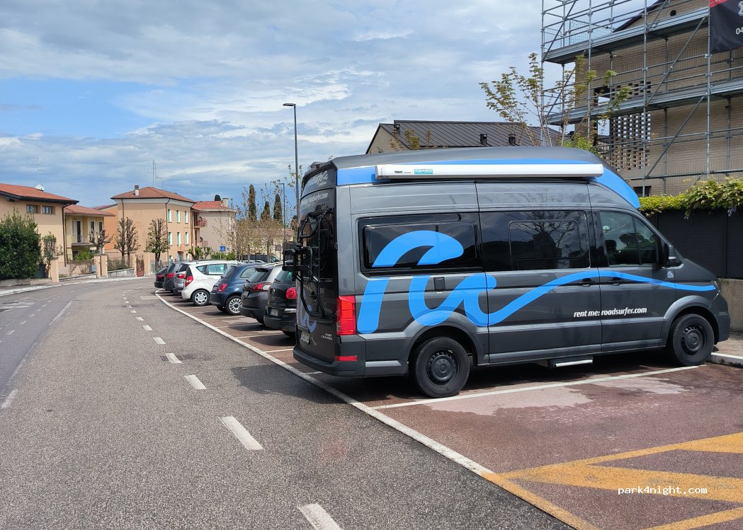 Free parking, stall for my short 6-meter camper but there is the possibility of protruding slightly on the sidewalk / flower bed, leaving room for passing pedestrians ... less than a km away from the center ... for us it was very comfortable! just be careful not to go with vehicles over 6 meters, it could be difficult for pedestrians to pass on the sidewalk!
