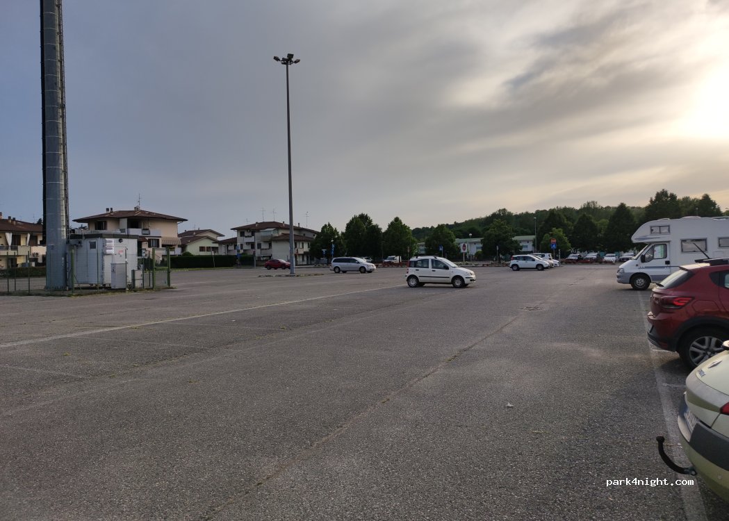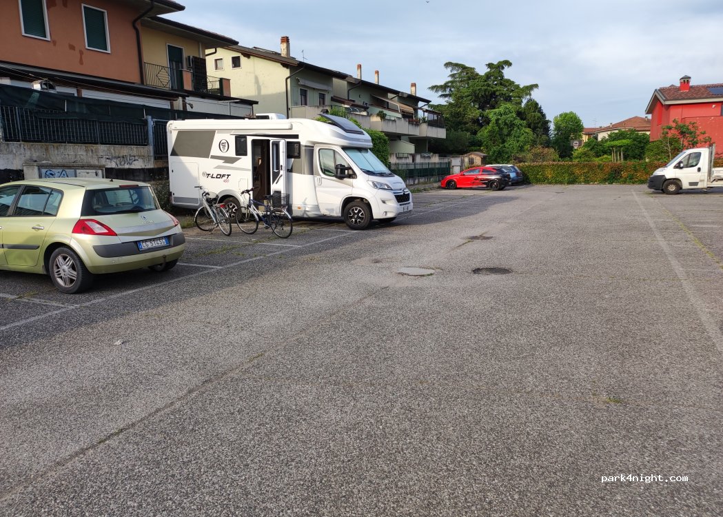 Parcheggio auto sia entrata che uscita sbarra altezza rimossa. Arrivati in giorno di mercato affollato a pochi metri in piazza, ma poi finito alle 12,30 la gente è andata via. Molto grande e silenzioso, in bici vicinissimo a Borghetto. No servizi. Camper 7 MT.