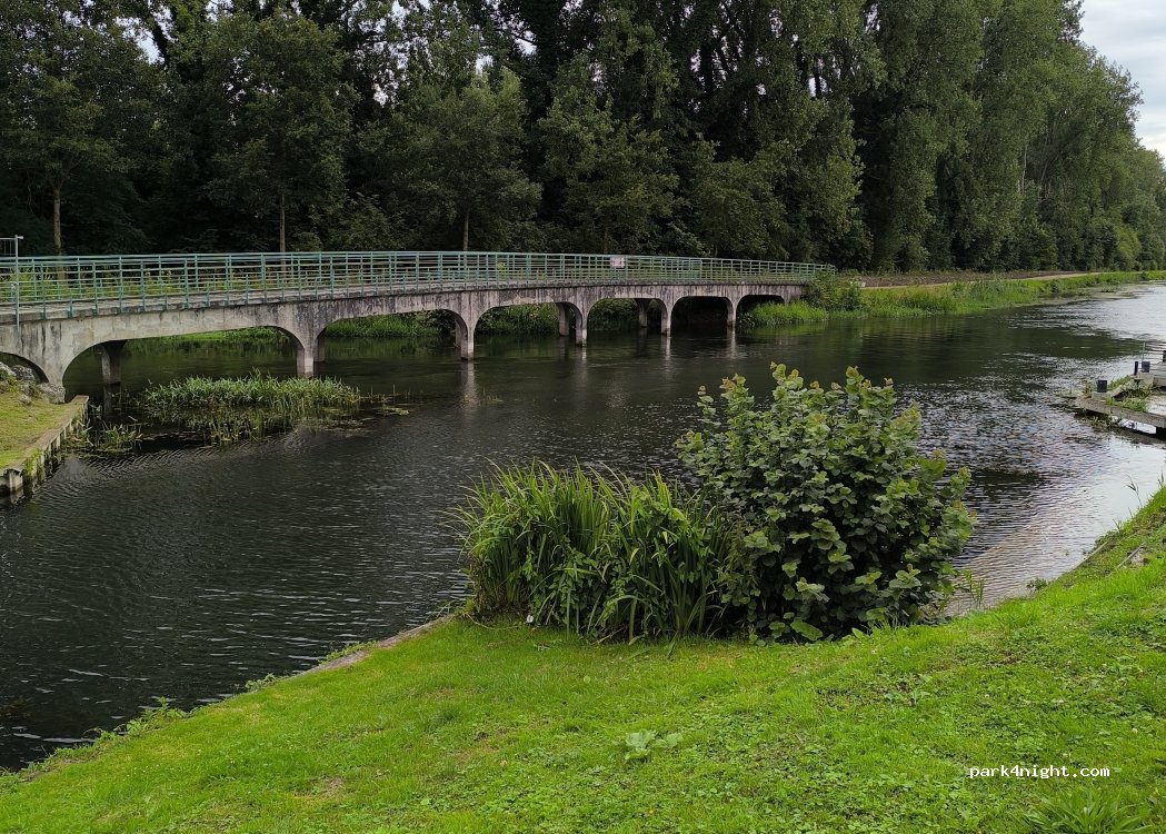 Soirée et nuit très agréables (pas entendu de train la nuit), garée bien à plat, aucun souci, quelques promeneurs de chiens, coureurs ou cyclistes, promenade bucolique au bord de l'eau. Même seule, je me suis sentie en sécurité. Je conseille à 100%.