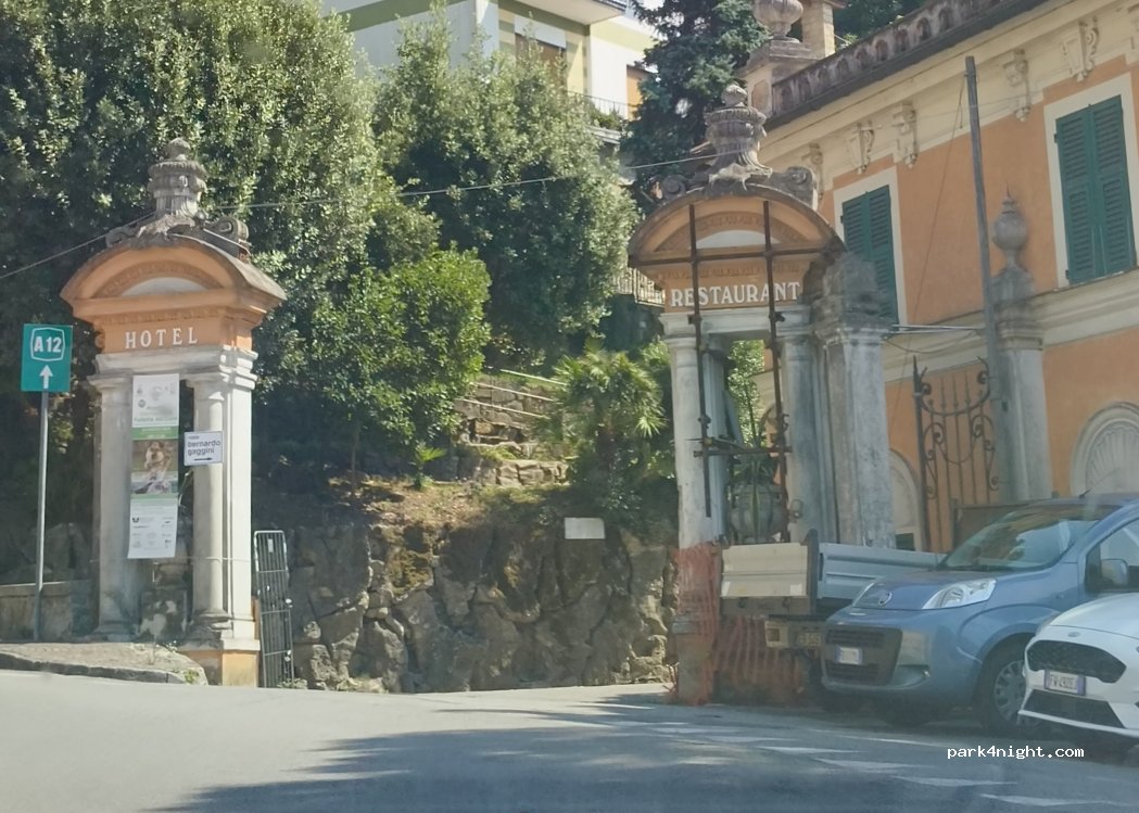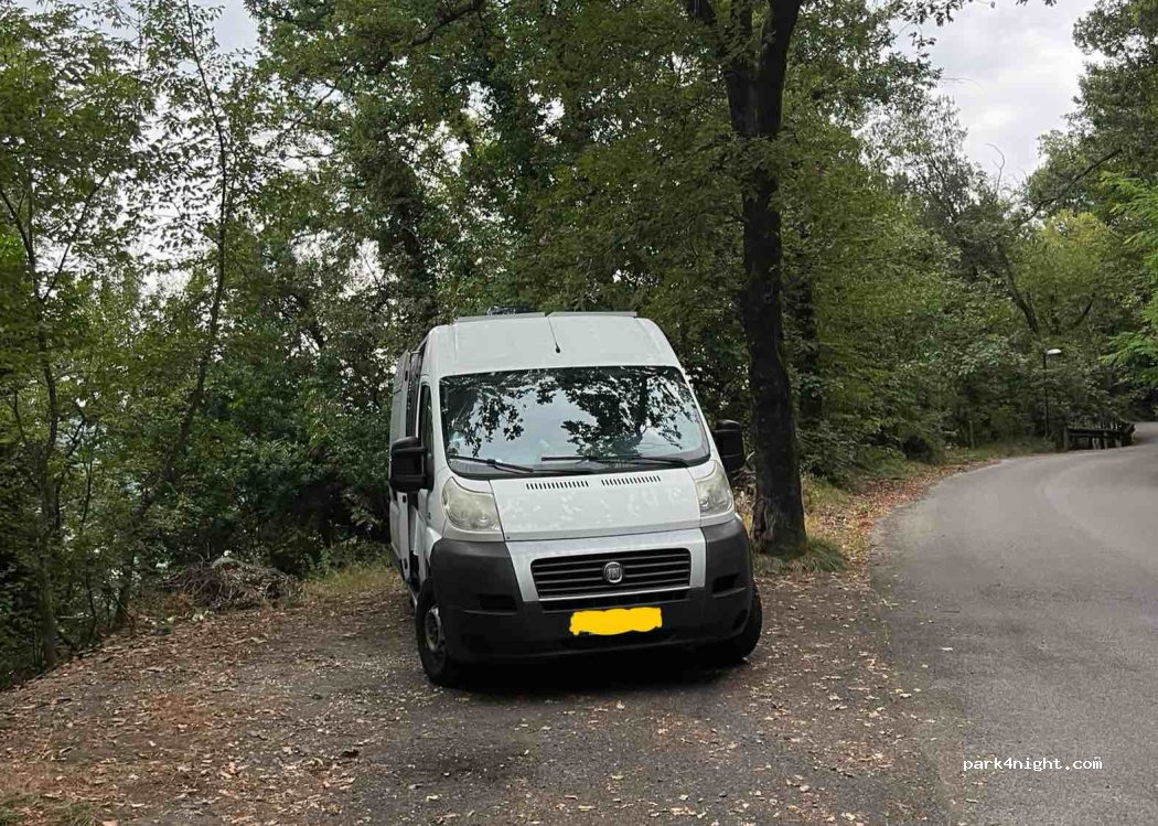 Un peu plus haut sur la route se trouve le grand parking de l’hôtel, qui est fermé. Ce parking est utilisé par les locaux qui vont se balader dans le parc. J’ai dormi là une nuit très tranquille. Les carabinieri sont passés quand je m’installais et n’ont rien dit. Magnifique vue.