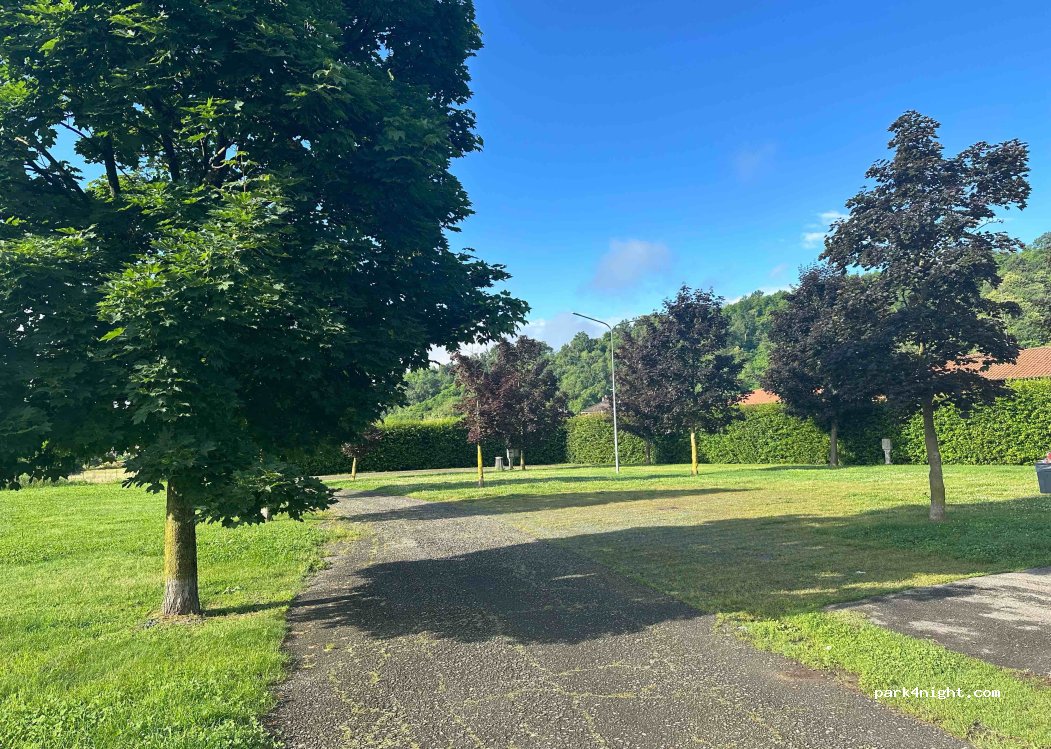 Grand espace de stationnement face au centre sportif multifonctionnel. Plat, en partie goudronné ou sur prairie pavée. Quelques arbres avec de l'ombre. Endroit calme, à 10 minutes à pied du centre ville. Itinéraire balisé avec le symbole camping-car. Décharge et alimentation possibles, colonnes de puissance hors service.