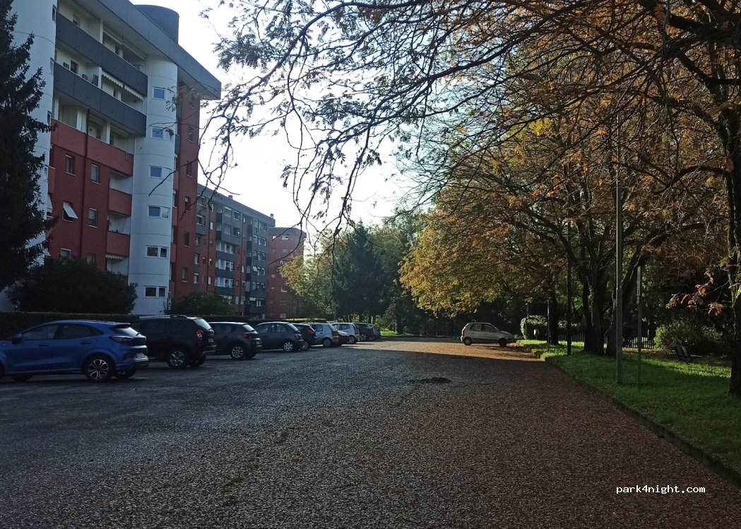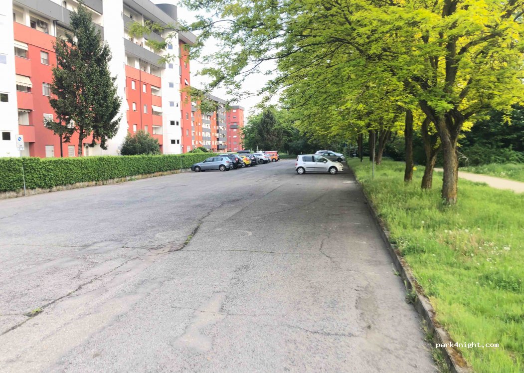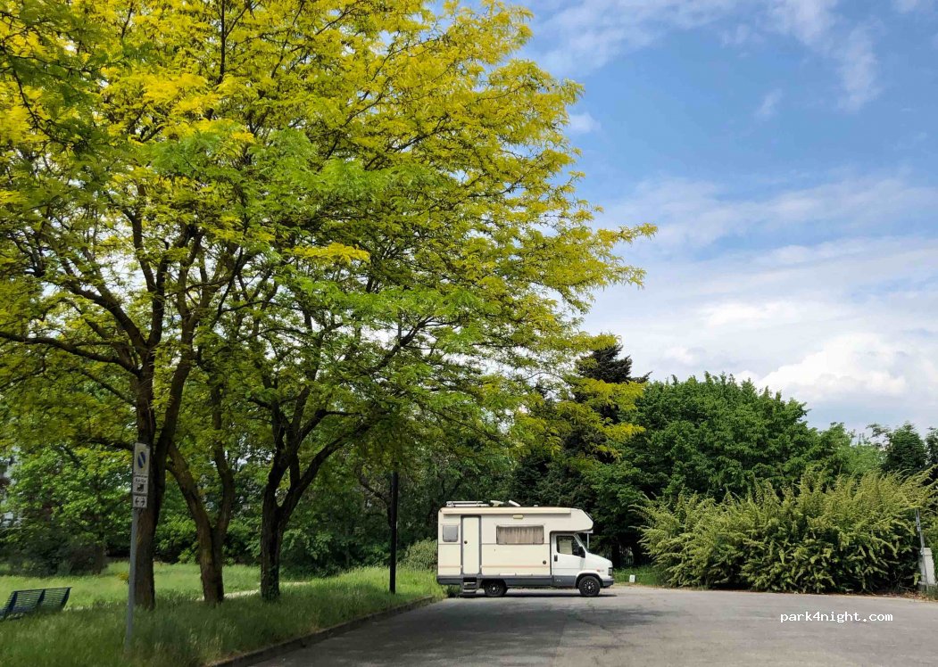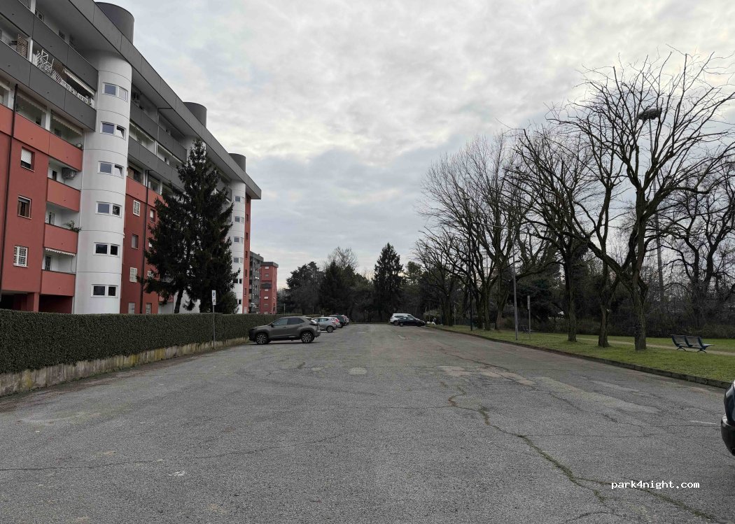 Dans un quartier calme. Un habitant nous a demandé de partir. En effet, aucune interdiction de stationner mais prévu pour les habitants. Nous sommes partis dans un des autres parkings du quartier. Nous avons passé 2 nuits sans problèmes. Cependant beaucoup de moustiques et bruit des avions. ZTL dans Milan, nous avons pris les vélos 40 minutes pour arriver au centre avec pistes cyclables.