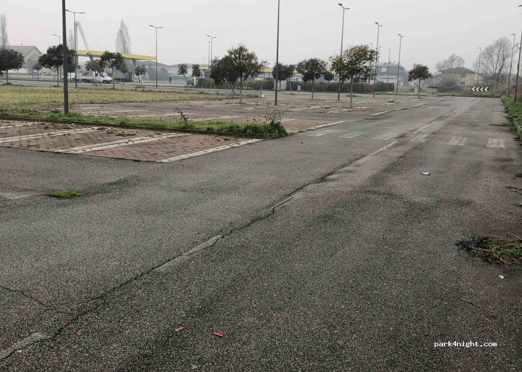 Oui un très grand parking plat et asphalte. Les bus italiens garent ici et aussi les camions. Choisissez de rester près des autobus car les frigo des camions se mettent en marche là nuit et ça peut faire un peu de bruit. Très bien dormi et très en sécurité. Le supermarché est en face du rond-point. Pas vu la fiat panda rouge ni la police. Nous sommes à 60 km de Venise. Camions et bus partent à 6h