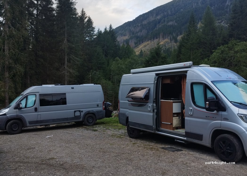 Parcheggio gratuito H24, aperto tutto l'anno (in inverno non viene pulito dalla neve). breve strada di accesso sterrata. 6 posti auto/van. ideale per Van e furgonati, no per grandi camper. Vari punti picnic nell'area