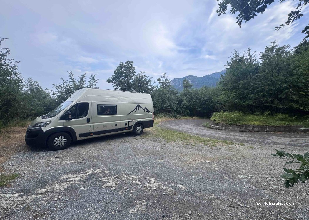 Kleiner Stellplatz an Hochstraße zu Klettersteig VIA FERRATA DEGLI ARTISTI. 10 Min. weiter ist man mit dem Auto am Parkplatz zum Klettersteig. Zwei Campervans haben Platz. Direkt an unbefahrener Straße. Zufahrt über enge Kehrtwenden und steile Straßen. Ebene Stellfläche. Schön ruhig und von Natur umgeben. Bitte keinen Müll hinterlassen.
