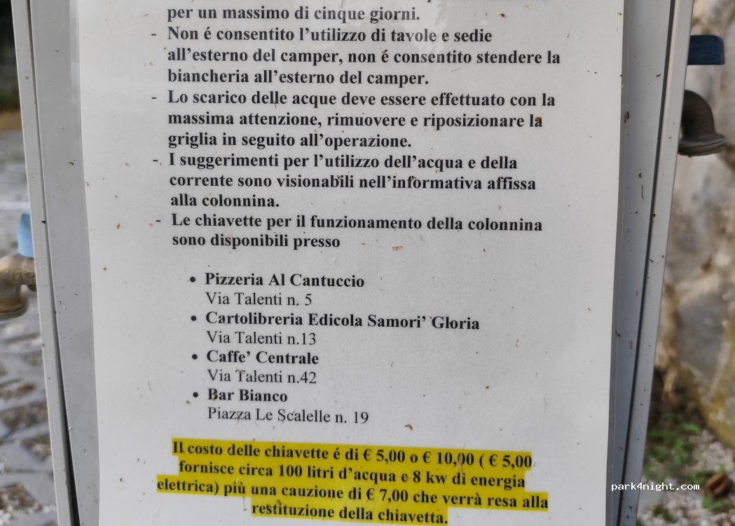 Posto molto bello e tranquillo. Area molto pulita. Per avere l'elettricità delle colonnine ci sono quattro possibilità di richiesta delle chiavi in negozi del paese. Carico e scarico non segnalato ma c'è. Paese a due passi con negozietti e alcune cose da vedere: teatro, residenza storica, museo delle castagne.