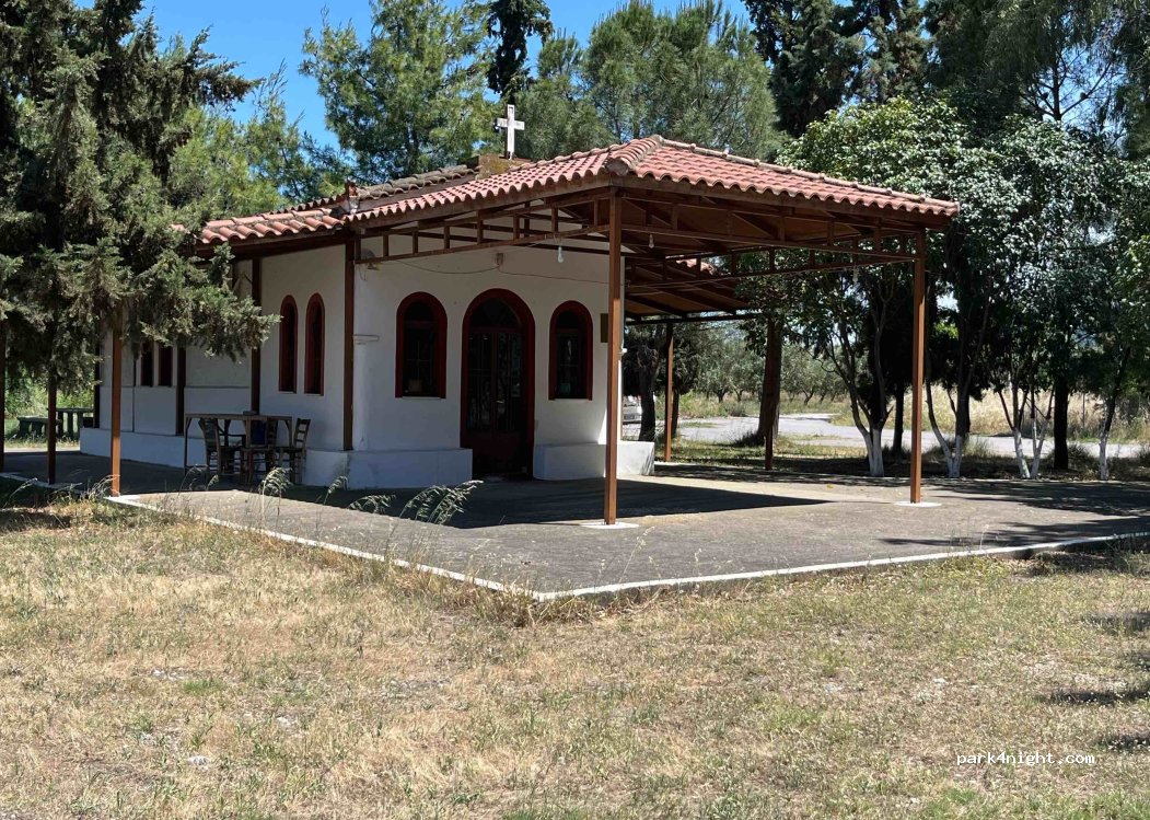 Une petite église à côté de laquelle on peut se garer à l’ombre (2/3 véhicules max). Très calme et proche de la mer pour aller se baigner. Des poubelles et de l’eau mais je ne sais pas si c’est potable. Route accessible entre les oliviers.