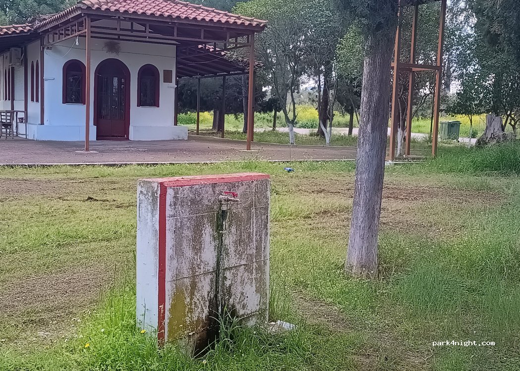 A small church next to which you can park in the shade (2/3 vehicles max). Very quiet and close to the sea to go swimming. Bins and water but I don't know if it's drinkable. Accessible road between olive trees.