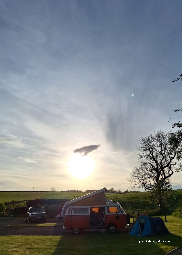 Rang ahead but the main site was full. However, was offerend a pich on the camping field. Lovely open enclosed mowed filed with water point. No EHU but didnt bother us. Addition of a converted horse box with toilet and shower and the elsan point on the outside. Really secluded position and the view over the distant hills was fabulous altohugh i guess could be a little exposed in bad weather.