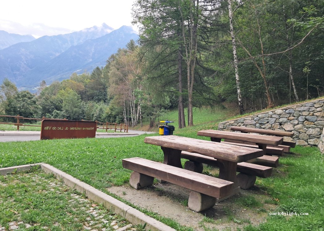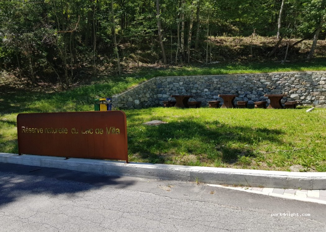 piccolo parcheggio, ideale x escursione al lago di Villa e x l' escursione challant art. ci sono 3 tavoli per pic nic,bidoncini x immondizia differenziata. Nessun servizio x carico e scarico acqua ne scarico wc,pannello solare x ricarica ebike e prese usb ( nn ho verificato se funziona). Non perfettamente in piano ma accettabile. Luogo tranquillo in mezzo alla natura.