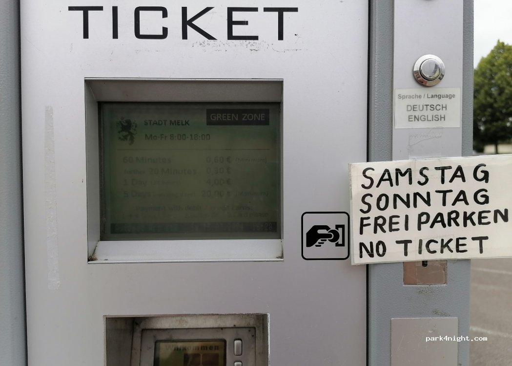 Great parking 6 mins away from Stift Melk. Free weekdays 18.00-9.00 and weekends. During weekdays paying hours: 0.60€ for 1h, after this first hour 0.30€ per 30mins up to 4€ a day. 20€ per week max. App available.