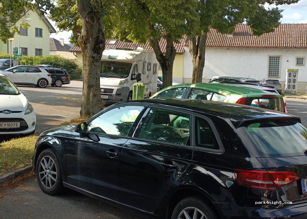 Inclinado, sin servicios, pero junto al centro de Melk y a la abadía. Además, con sombra. Desgraciadamente, algunos no respetan los espacios, como se ve en la foto. Son los responsables de las prohibiciones que nos van poniendo. A 2 km, al otro lado del pueblo, hay otro espacio en el que caben las autocaravanas grandes. Una pena.