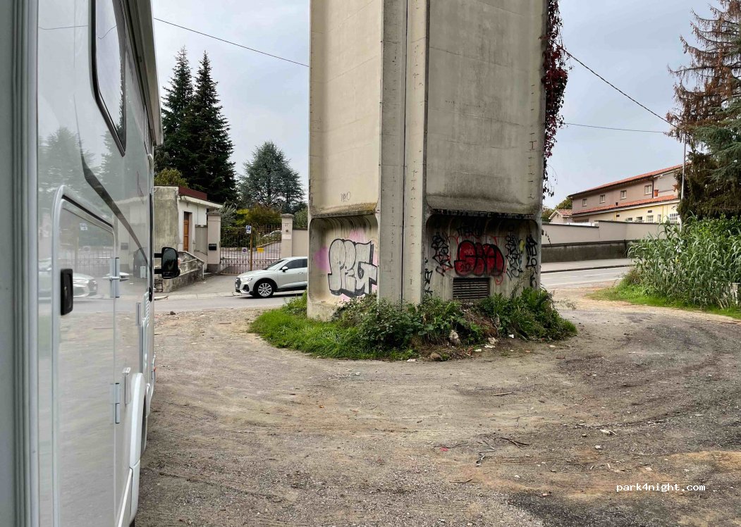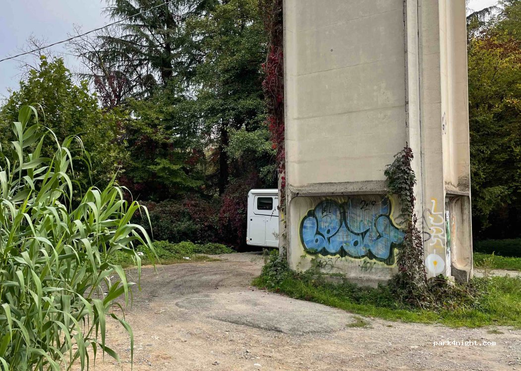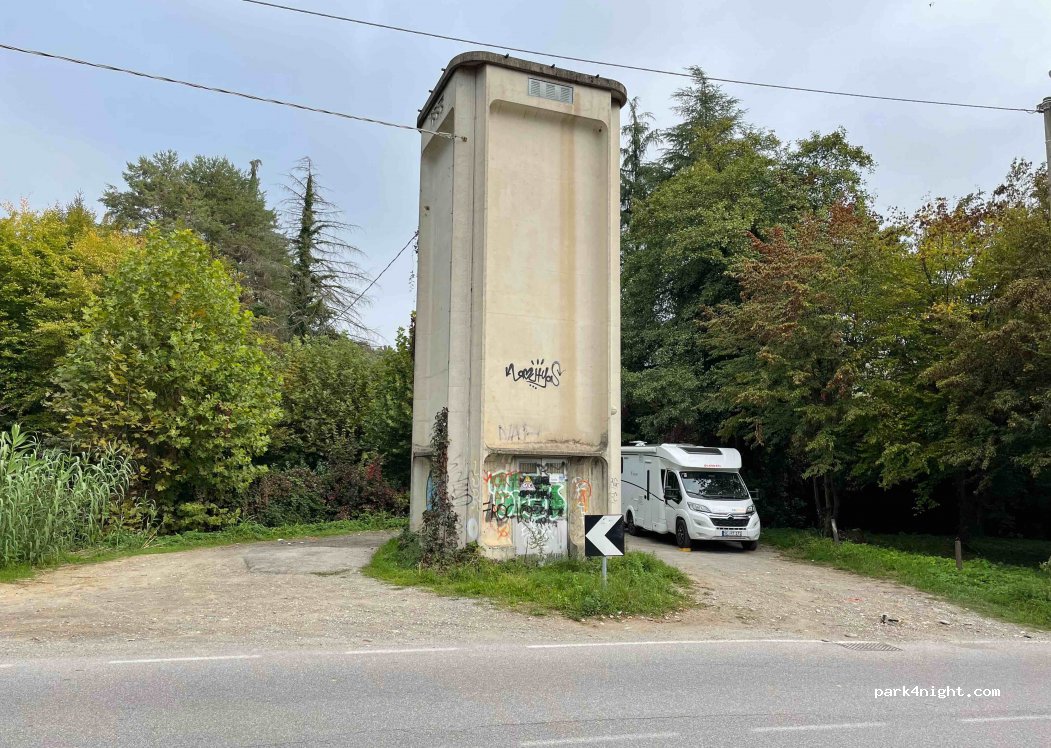 Kleiner wende-/ parkplatz rund um "elektro"(?) turm, 3 seiten hecke, bach, park?: wiese, bäume. Über nacht ruhig, morgens hat die kleine straße doch etwas verkehr ab 8" wochentags. Etwas müllig diesmal. ruhiger vorort v bergamo. nachts im dunkeln gut etwas versteckt wenn zurückgesetzt stehend... viel spaß!