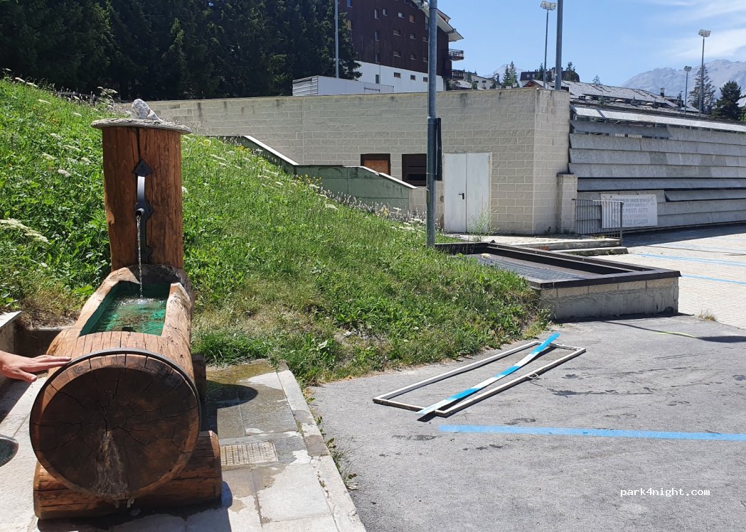 Punto acqua potabile nel parcheggio su strada. Da giugno a dicembre il parcheggio in paese è gratuito. Non so se l'acqua è disponibile anche in inverno con il congelamento.