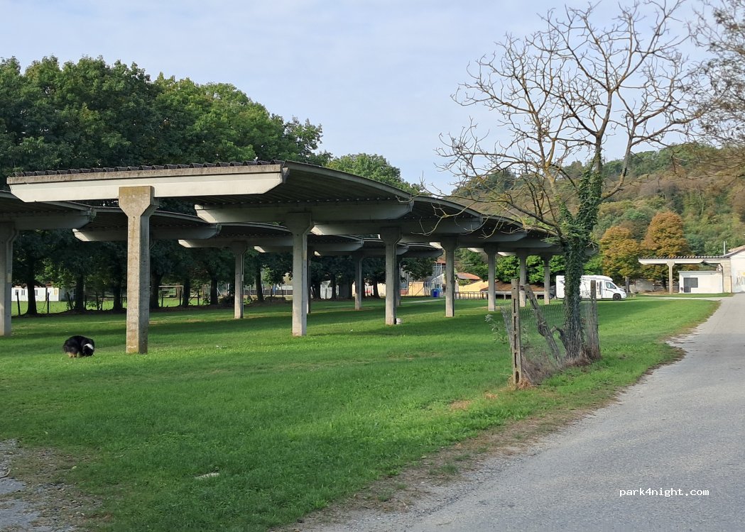 Vaste parking gratuit, herbeux et plat le long du terrain de foot, aucun bruit même pas la cloche. Carports très hauts sur tous les emplacements du milieu. A l'entrée poubelles de tri, fontaine et pesée de camions, utilitaires, tracteurs, contre 2€50. Il fait 17° le jour et 7° la nuit, il n'y a donc plus de moustiques ! A recommander sans hésitation