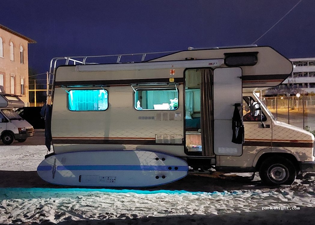 Parcheggio sterrato vicino a una spiaggia pubblica. Ideale per una breve sosta al mare o per un pernottamento. Zona molto tranquilla, sorvegliata dalle telecamere degli stabilimenti balneari limitrofi. Di notte spesso passano auto o camion della spazzatura, che potrebbero svegliarvi. È meglio parcheggiare al centro del parcheggio. I cani sono ammessi nel parcheggio, ma non in spiaggia. I servizi igienici sono aperti dalle 8:00 circa. Potete ritirare la chiave in spiaggia. Il proprietario sarà felice di offrirgli un caffè in cambio :)